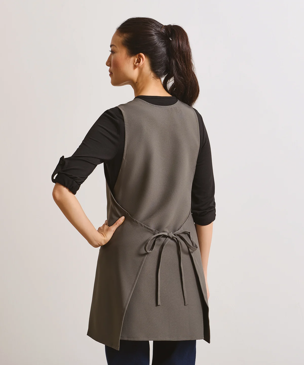Over the head wrap around tunic, Fastens from front to back with self-fabric ties. Double front pocket. V-neck styling. Length of 83cm.